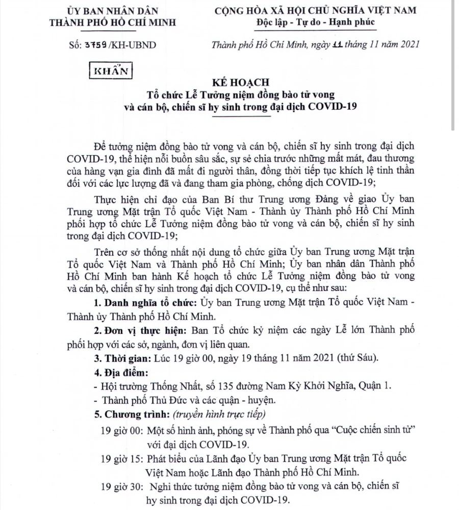 Phó Chủ tịch UBND TP.HCM Võ Văn Hoan vừa ký ban hành kế hoạch số 3759 về tổ chức lễ tưởng niệm đồng bào tử vong và cán bộ, chiến sĩ hi sinh trong đại dịch COVID-19. Đây là buổi lễ thể hiện nỗi buồn sâu sắc, sự sẻ chia trước những mất mát, đau thương của hàng vạn gia đình đã mất đi người thân, đồng thời tiếp tục khích lệ tinh thần đối với lực lượng đã và đang tham gia phòng chống dịch COVID-19.