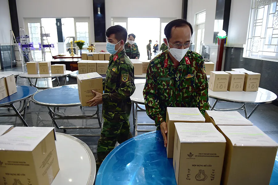 Bộ đội thuộc Bộ Tư lệnh TP.HCM đưa tro cốt của những người qua đời vì COVID-19 từ Trung tâm Hỏa táng Bình Hưng Hòa (quận Bình Tân) về tập trung tại Nhà tang lễ TP.HCM. Ảnh: A.TÙNG