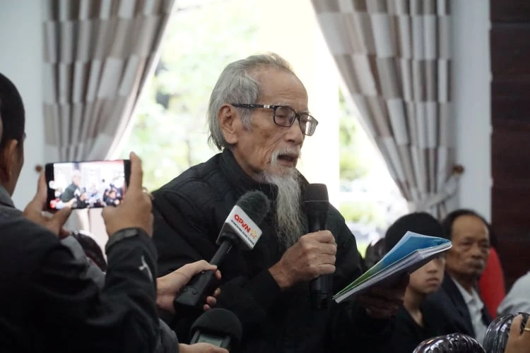 Thân nhân các liệt sĩ phát biểu tại buổi họp báo. Ảnh: BÙI TOÀN