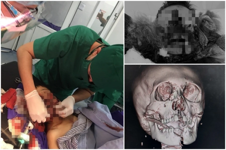 Kết quả chụp cắt lớp cho thấy bé bị dập nát khoang miệng, tổn thương phức tạp vùng hàm mặt, gãy xương hàm, dập nát môi, dập khí quản.
