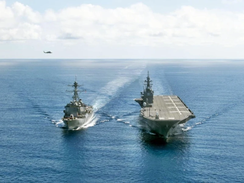 Tàu khu trục trang bị tên lửa USS Dewey đi qua biển Đông cùng tàu sân bay trực thăng JS Izumo của Nhật hôm 27-5. Ảnh: HẢI QUÂN MỸ