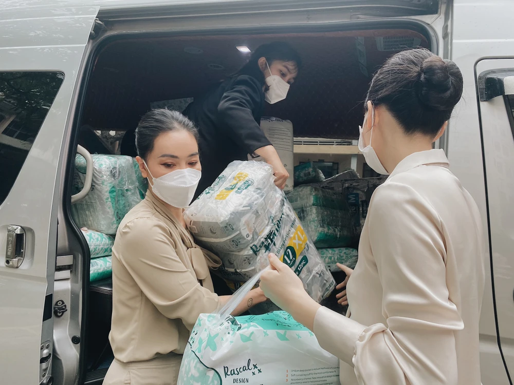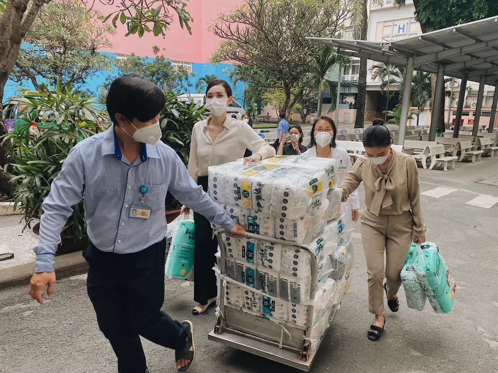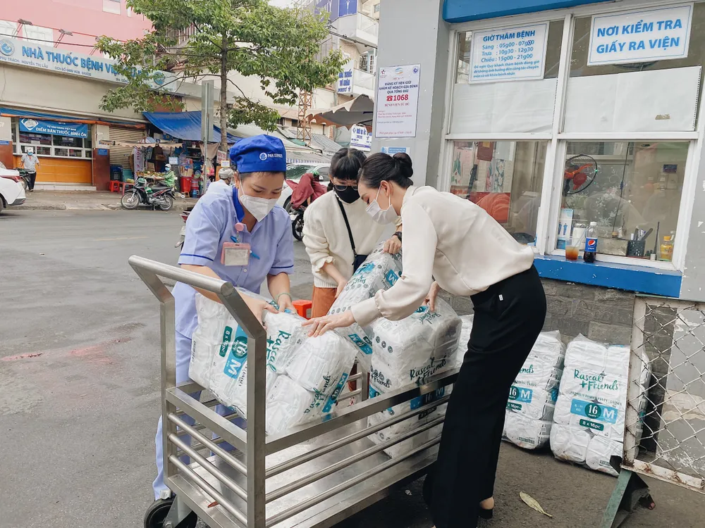 Bên cạnh đó, Á hậu Tường San cũng đã mang hơn hàng trăm phần tã đa dạng các kích thước đến khoa Nhi của bệnh viện Từ Dũ.