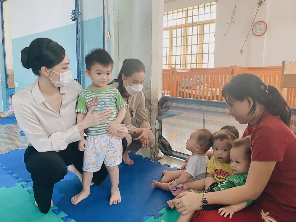 Đây là một mái ấm – nơi nuôi dạy 125 trẻ em từ 0 đến 10 tuổi. Sau khi được chị Hạnh là quản lý mái ấm hướng dẫn đến các khu vực sinh hoạt, Á hậu Tường San và bà Phạm Kim Dung không khỏi bất ngờ bởi sự nồng nhiệt của các bé.