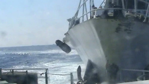 Lan can của tàu Cảnh sát biển Việt Nam gãy vụn sau cú đâm hung hăng của tàu hải cảnh Trung Quốc. Nguồn Cảnh sát biển Việt Nam Đồng thời, tàu Hải cảnh của Trung Quốc đã ngăn cản, dùng súng bắn nước vào tàu Kiểm ngư 628 của ta khi tiếp cận cách giàn khoan Trung Quốc 5,3 hải lý.