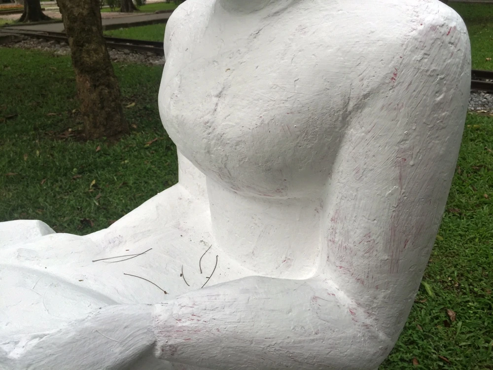 Theo ghi nhận của PLO ngày 27-5, nhiều bức tượng dù được phủ lại màu trắng nhưng vẫn không thể mất hẳn được các màu sặc sỡ trước đó.