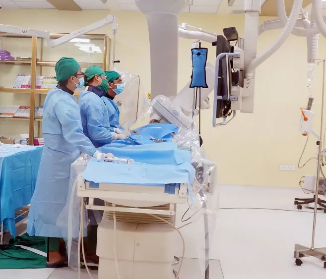 Các bác sĩ đang tiến hành đặt stent thông mạch vành cho ông B. Ảnh: LÊ PHỤNG