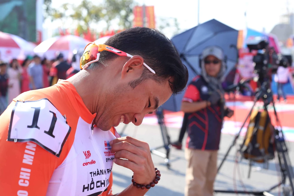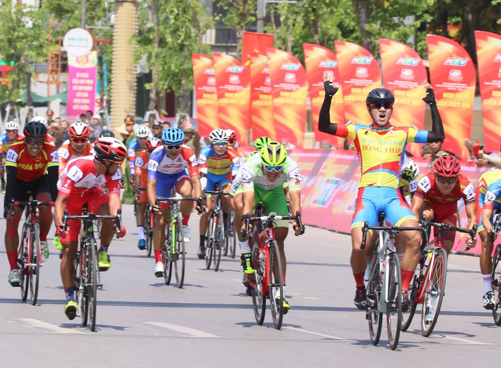 Tay đua Nguyễn Tấn Hoài mừng chiến thắng chặng khai mạc Cúp Truyền hình. ẢNH: HUỲNH VĂN THUẬN