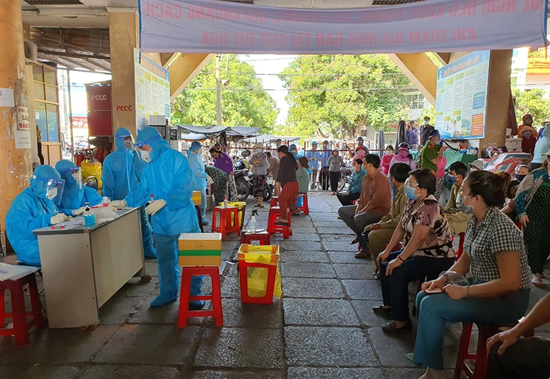 Lấy mẫu xét nghiệm cho toàn bộ tiểu thương chợ Tuy Hòa. Ảnh: MINH KHÔI