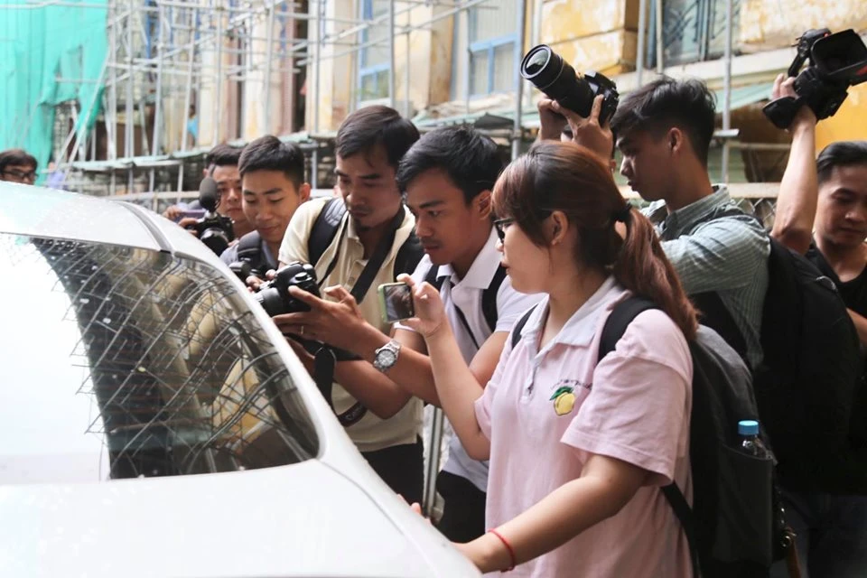 Bị cáo Linh đến tòa nhưng phải ngồi khá lâu trong ô tô vì vòng vây của phóng viên bên ngoài. Ảnh: TRƯỜNG GIANG