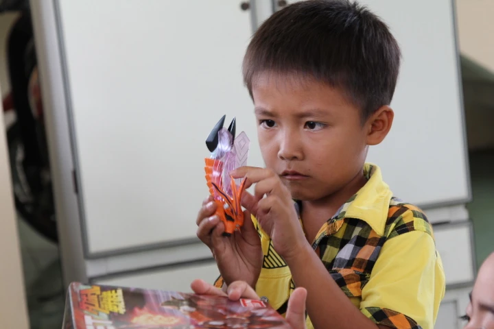 Con trai bị cáo đang chơi trò chơi ngoài phòng xử . Ảnh: Hồng Tú