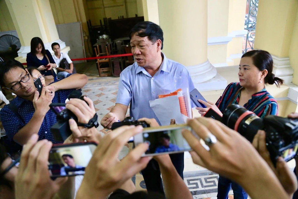 Ông Ngô Nhật Phương trước khi tòa tuyên án lại tiếp tục bên hành lang cung cấp tài liệu nhưng khi sau đó lại nhanh chóng rời khu vực phòng xử khi bắt đầu tuyên án. Ảnh: HOÀNG GIANG