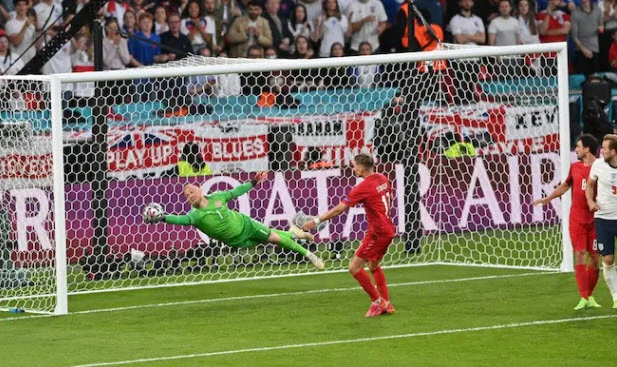 Sức ép dữ dội của Anh cũng được đền đáp ở những phút cuối hiệp phụ thứ nhất. Sterling đi bóng lắt léo trong vòng cấm trước sự áp sát của hai cầu thủ Đan Mạch rồi ngã ra sân, trọng tài Makkelie ngay lập tức chỉ tay vào chấm 11m bất chấp sự phản đối của đội khách. Khi check lại VAR, quyết định thổi 11m vẫn không thay đổi.