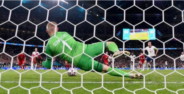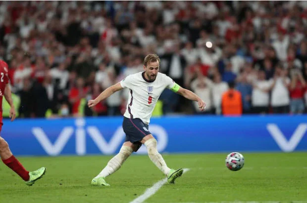 Phút 104, trên chấm penalty, Kane sút vào góc phải bị Schmeichel đoán đúng hướng đẩy ra nhưng ngay lập tức Kane lao vào đá bồi ghi bàn nâng tỉ số lên 2-1 cho Anh.