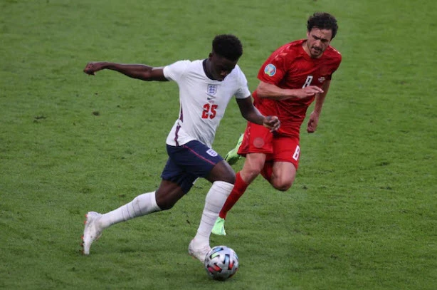 Phút 39, Kane có pha chọc khe xẻ nách cho Saka thoát xuống căng ngang vào, dưới sức ép của Sterling, trung vệ đội trưởng Kjaer lúng túng chạm bóng đốt lưới nhà để người Anh gỡ hòa 1-1 trước khi hai đội bước vào giờ nghỉ giữa hai hiệp.