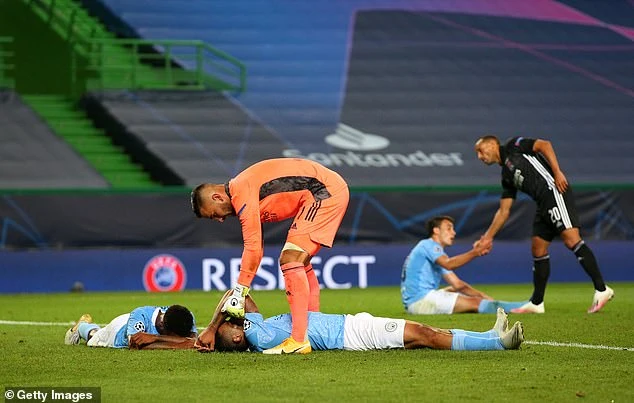 Cầu thủ Man City buồn bã ngã vật ra sân sau thất bại trước Lyon mùa trước. ẢNH: GETTY