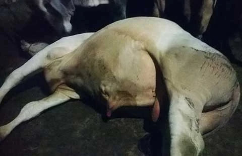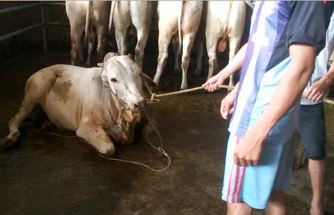 Sau đó một con bò không đứng nổi, nằm bệt xuống sàn nhà.