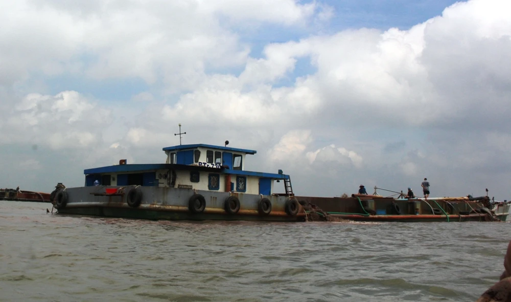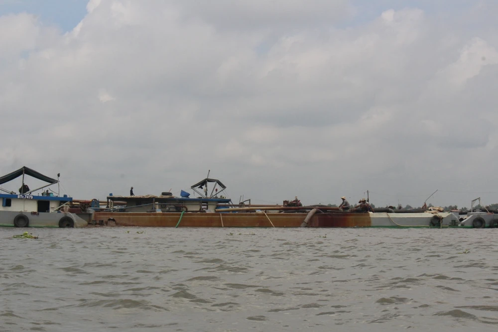 Khai thác cát trên sông Hàm Luông. Ảnh: ĐÔNG HÀ