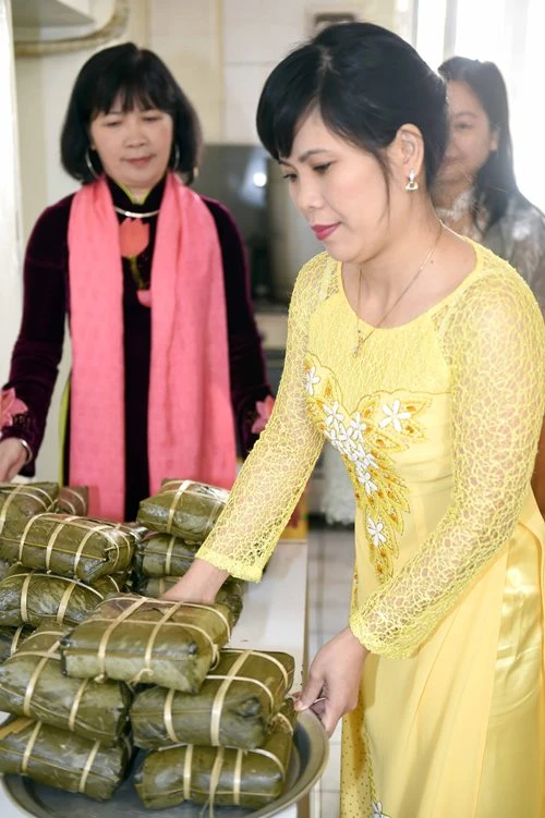 Các nhân viên Đại Sứ quán chuẩn bị bữa tiệc với những chiếc bánh chưng