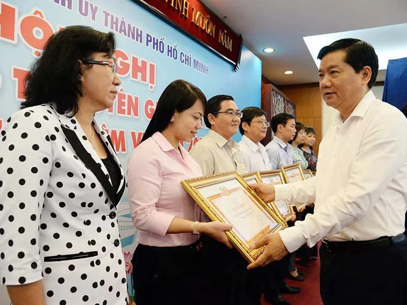 Bí thư Thành ủy TP.HCM Đinh La Thăng đang trao giấy khen cho đại diện các tập thể của ngành tuyên giáo TP.HCM. Ảnh: LONG HỒ