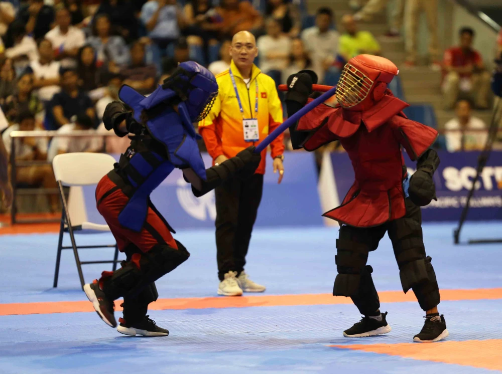 Nếu như Kurash Việt Nam tạo “cơn mưa” vàng hôm nay với 5 huy chương thì môn võ gậy Việt Nam hôm nay lại thảm bại trắng tay. Mặc dù đánh bại các đối thủ từ Campuchia và Myanmar nhưng khi vào chung kết, tuyển võ gậy Việt Nam thua tơi tả đội chủ nhà Philippines cả năm trận.