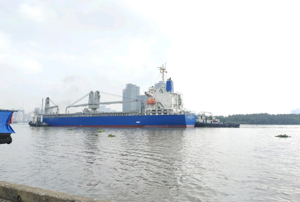 8 giờ, ngày 13-7, tàu chở hai đoàn tàu metro đã cập cảng Khánh Hội, quận 4. Ảnh: MAUR.