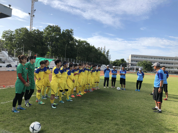 Đội tuyển nữ Việt Nam tập làm quen sân đấu tại Chonburi. Ảnh: VFF