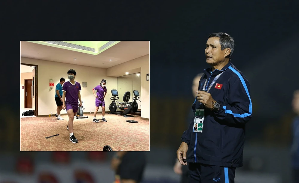 HLV Mai Đức Chung lo lắng gần đến ngày thi đấu mà chỉ có năm cầu thủ tập thể lực trong khách sạn hồi hộp chờ đồng đội còn ở châu Âu mau âm tính. Ảnh: CTV