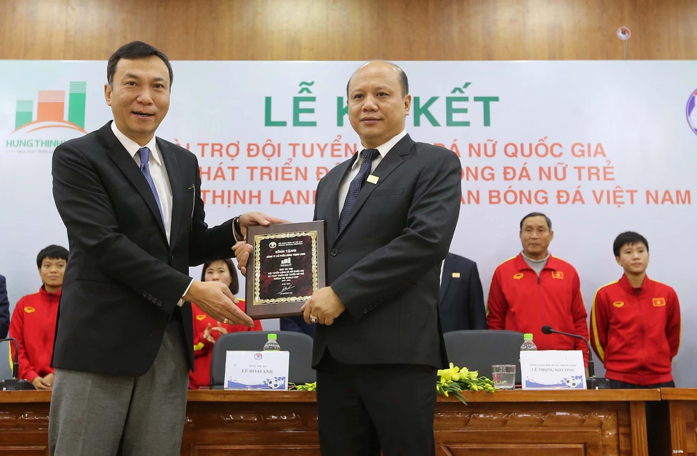 VFF và Hưng Thịnh Land ký kết hợp đồng tài trợ bóng đá nữ Việt Nam 100 tỉ đồng. ẢNH: NGỌC DUNG