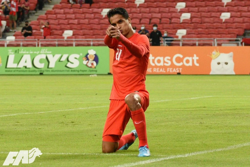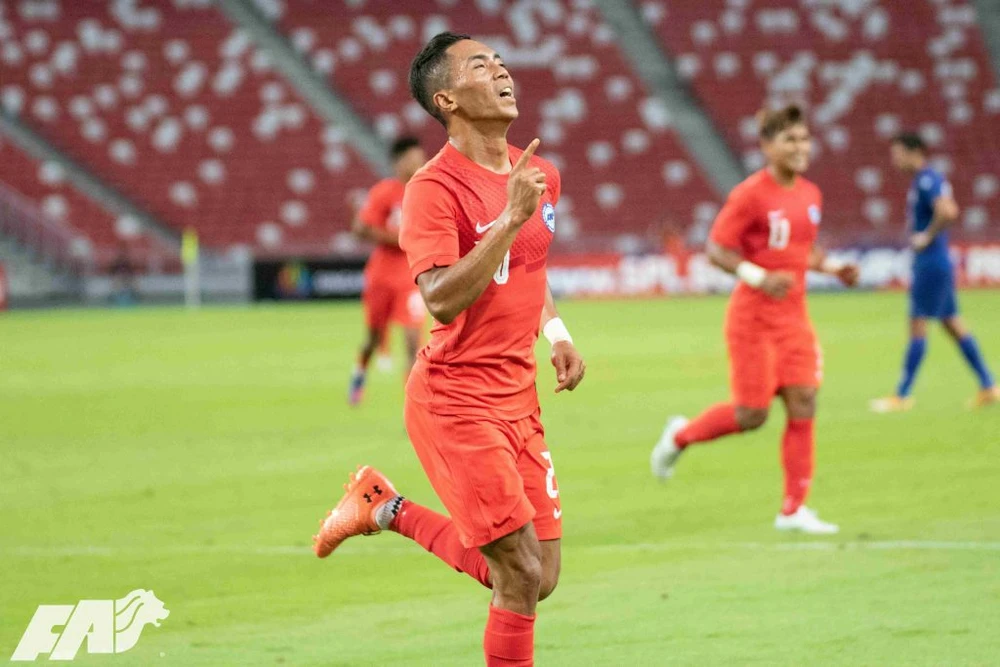Shawan Anuar "chốt" chiến thắng 2-0 cho Singapore phút 90. Ảnh: FAS