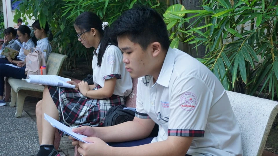 Có mặt rất sớm tại điểm thi trường THPT Lương Thế Vinh, quận 1, Võ Minh Đức, học sinh trường THCS Nguyễn Hữu Thọ tranh thủ ôn lại bài.