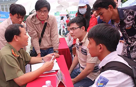 Thiếu tá Trần Văn Tuấn, Phó Trưởng phòng Phụ trách phía Nam Cục Đào tạo (Bộ Công an), tư vấn cho thí sinh dự thi vào các trường công an năm 2014. Ảnh: QUỐC DŨNG