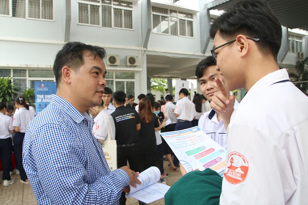 ThS Lê Phan Quốc, Phó Trưởng phòng Đào tạo Trường ĐH Sư phạm TP.HCM, đang tư vấn về các ngành học cho học sinh tại Trường THPT Gia Định (TP.HCM). Ảnh: ĐẶNG TRUNG