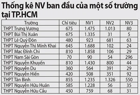 Từ số liệu thống kê ban đầu cho thấy tỉ lệ chọi NV1 tăng đều tất cả trường, ở những trường tốp trên vẫn thuộc mức cao nhất như THPT Nguyễn Thị Minh Khai, THPT Nguyễn Thượng Hiền , THPT Gia Định… Riêng ở NV2 và 3, số HS đăng ký nhiều cũng là các trường thuộc tốp giữa khiến cơ hội vào các trường này của các em ít nhiều sẽ có cạnh tranh mạnh. Cao nhất là THPT Nam Kỳ Khởi Nghĩa với 1.918 hồ sơ (chỉ tiêu 765); hay THPT Nguyễn An Ninh, tuyển 675 chỉ tiêu, đăng ký NV1 chỉ 489 hồ sơ nhưng NV2 và 3 lần lượt là 1.233 và 1.537 hồ sơ…