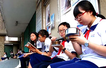 Học sinh tranh thủ ăn cơm chiều trước khi vào lớp ôn thi tại Trường Trần Đại Nghĩa, TP.HCM năm 2014. Ảnh: ĐNT