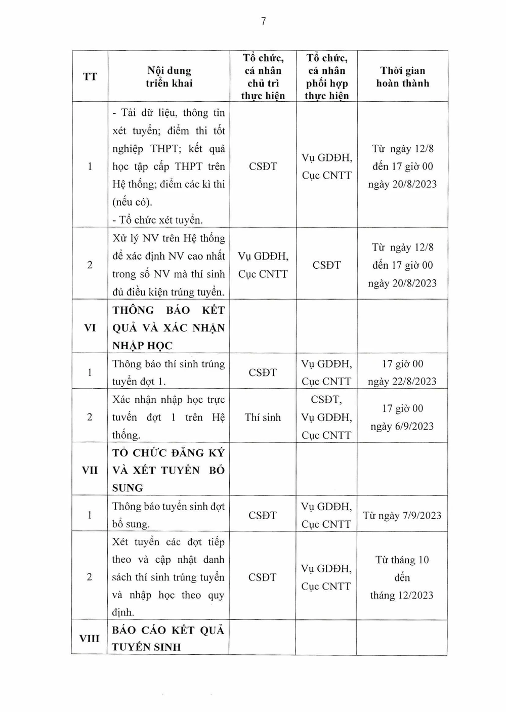 Từ tháng 10 đến tháng 12-2023: Xét tuyển các đợt tiếp theo và cập nhật danh sách thí sinh trúng tuyển và nhập học theo quy định.