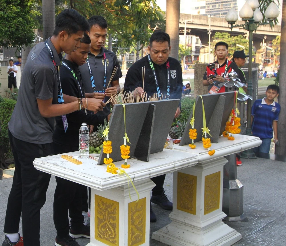 Tuyển Thái Lan trước giải, trước từng trận đấu họ cũng làm những nghi thức mang màu sắc tâm linh để có được kết quả tốt.