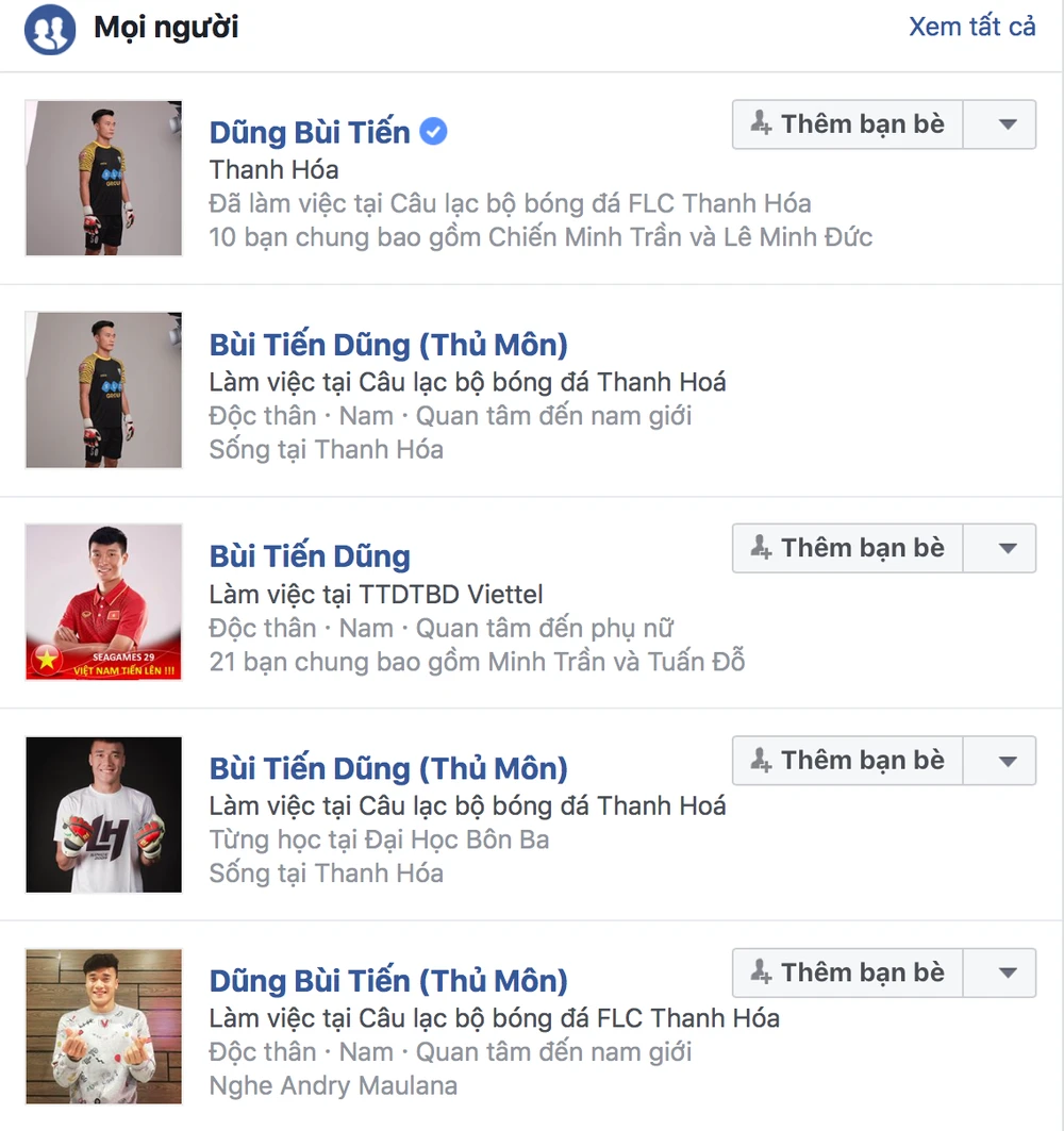 Ước tính có khoảng vài trăm tài khoản giả mạo, ăn theo tên cầu thủ xứ Thanh như Bùi Tiến Dũng (Thủ môn), Dũng Bùi Tiến (Thủ môn), Dung Tien Bui… nhằm mục đích “câu view, câu like” từ người dùng cả tin.