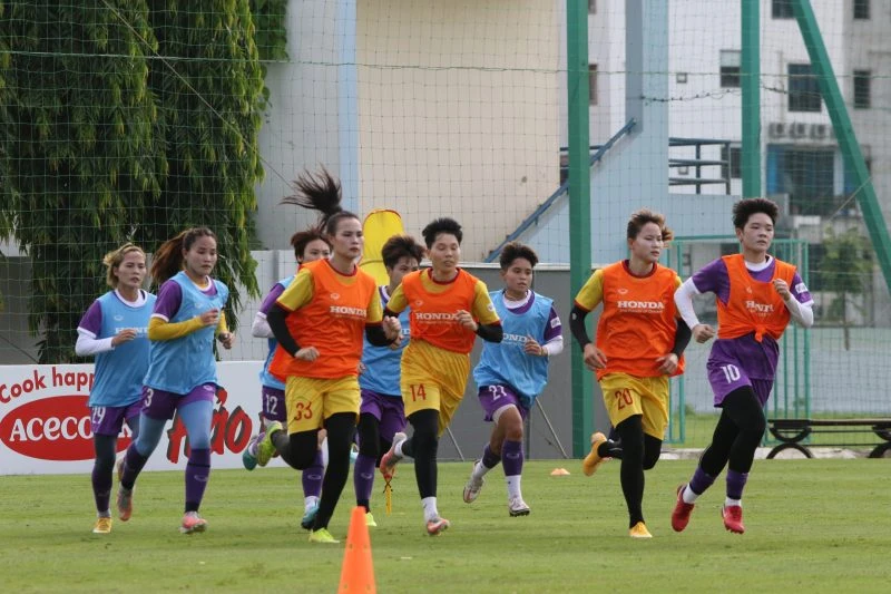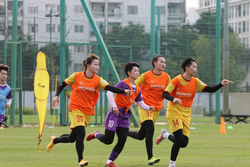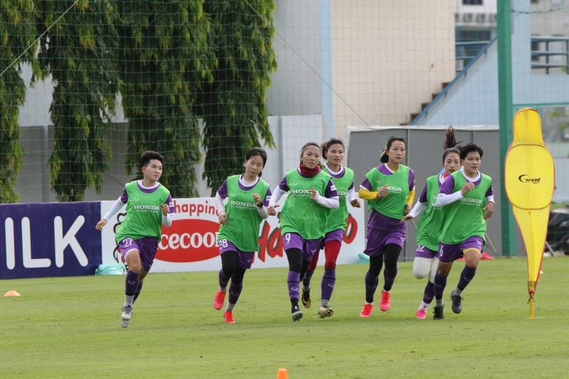Các cô gái Việt Nam tập luyện hăng say chuẩn bị vòng loại Asian Cup 2022. Ảnh: AN.