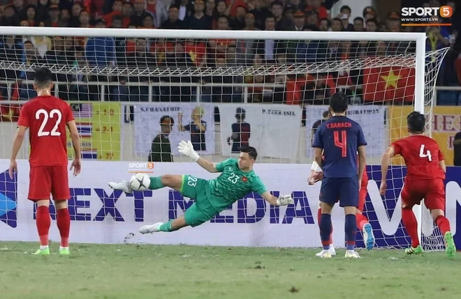 Thủ môn Văn Lâm cản phá cú sút phạt đền của hậu vệ Thái Lan Theerathon Bunmathan. Ảnh: AN.