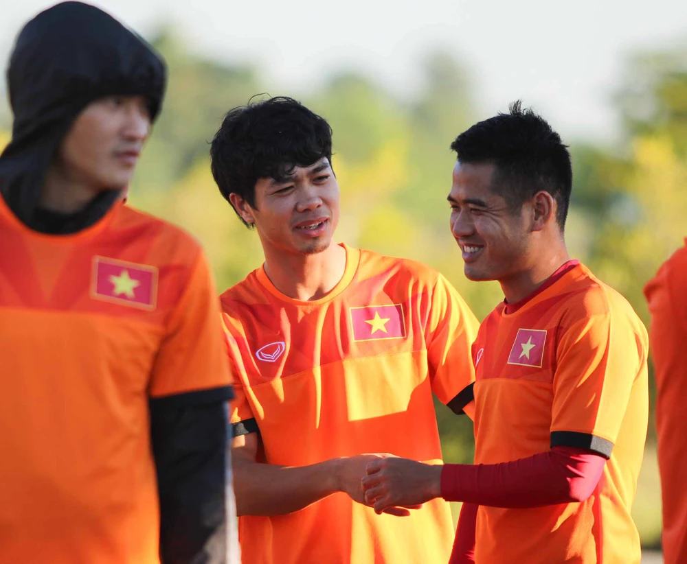 Thoải mái sau hai trận thắng giành chiếc vé đầu tiên bảng B vào bán kết, Âu Văn Hoàn thỏa sức vui đùa cùng đàn em Công Phượng.