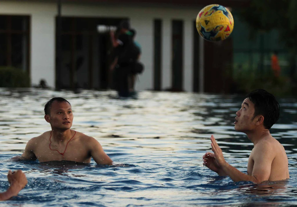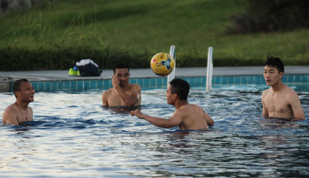 Cuối buổi tập, trò chơi vận động đánh đầu dưới nước được cầu thủ ghi bàn thắng trận Malaysia - Trọng Hoàng, Đình Luật, Văn Hoàn, Xuân Trường hưởng ứng rất nhiệt tình.