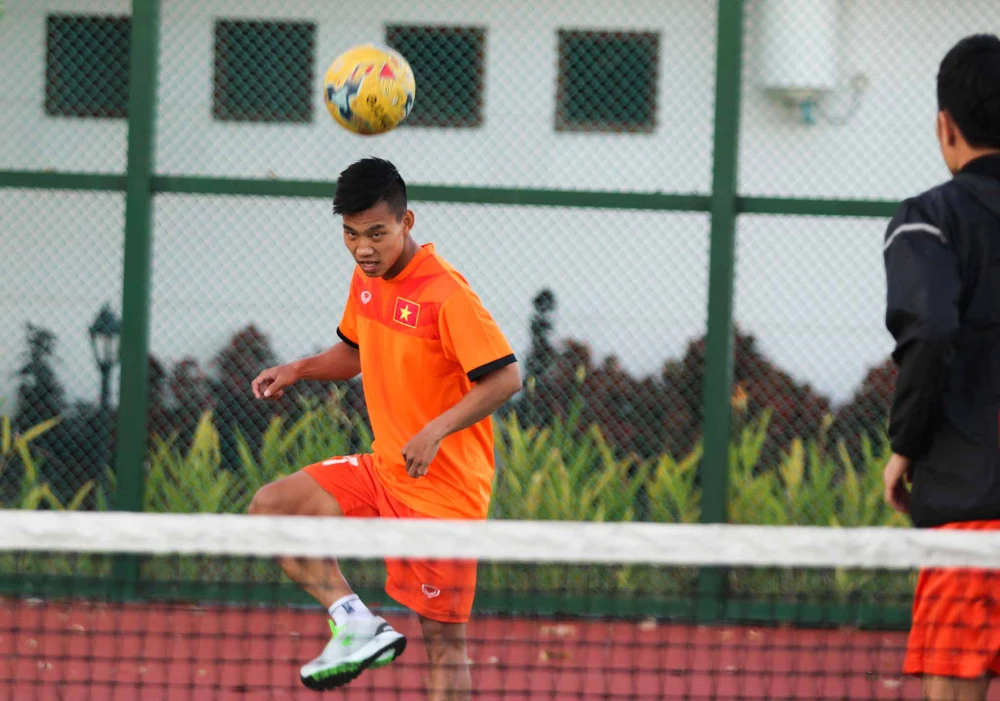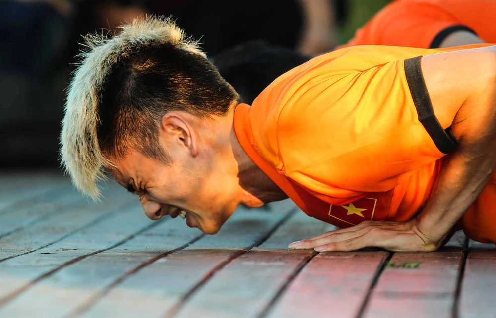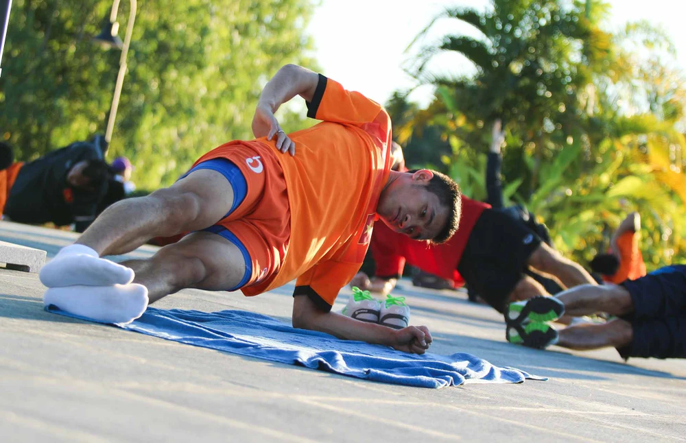 Trong bài tập chống đẩy tăng sức mạnh cho đôi chân, Tiến Thành tỏ ra khá mệt nhọc. Nhưng sau đó tuyển thủ này vẫn vui vẻ cười đùa cùng đồng đội.