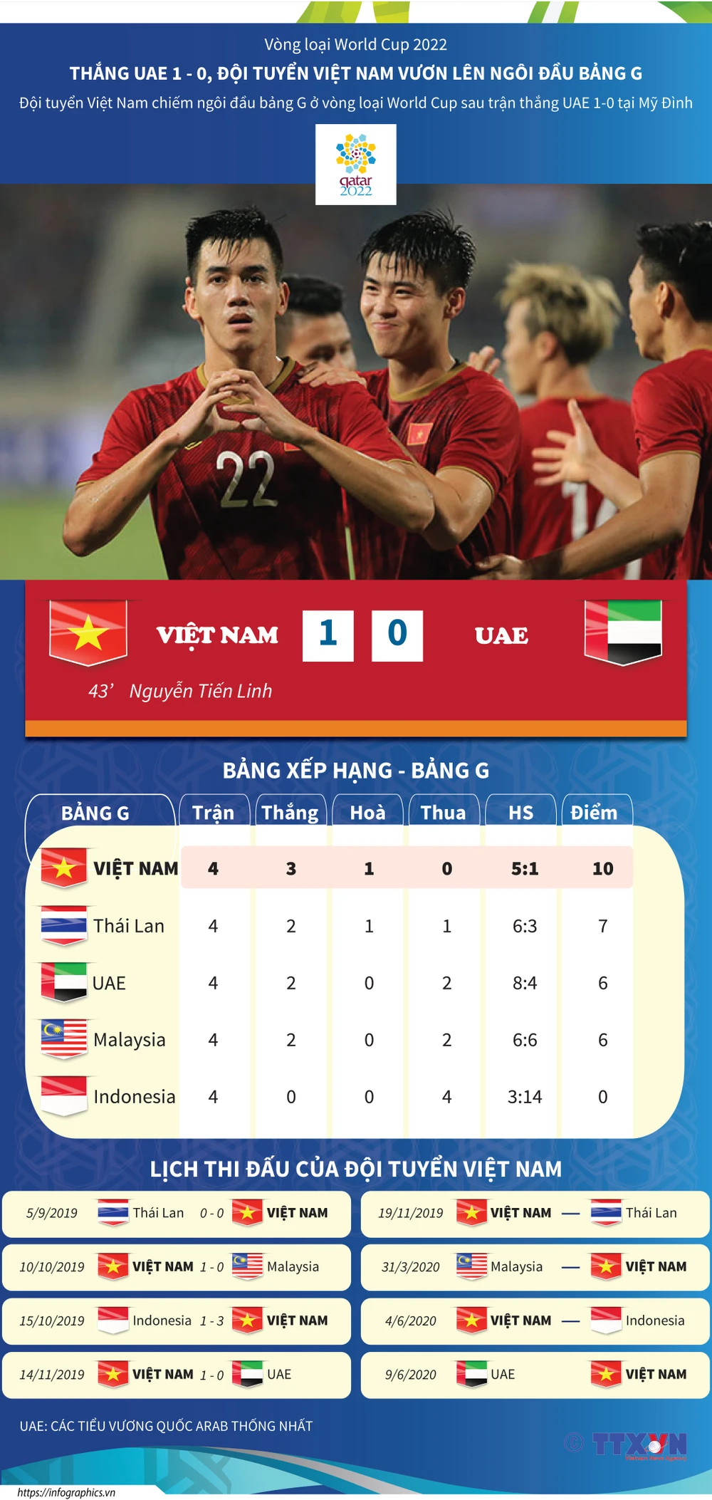 Đội tuyển Việt Nam chiếm ngôi đầu bảng G ở vòng loại World Cup sau trận thắng UAE 1-0 ngày 14-11-2019 tại Mỹ Đình.