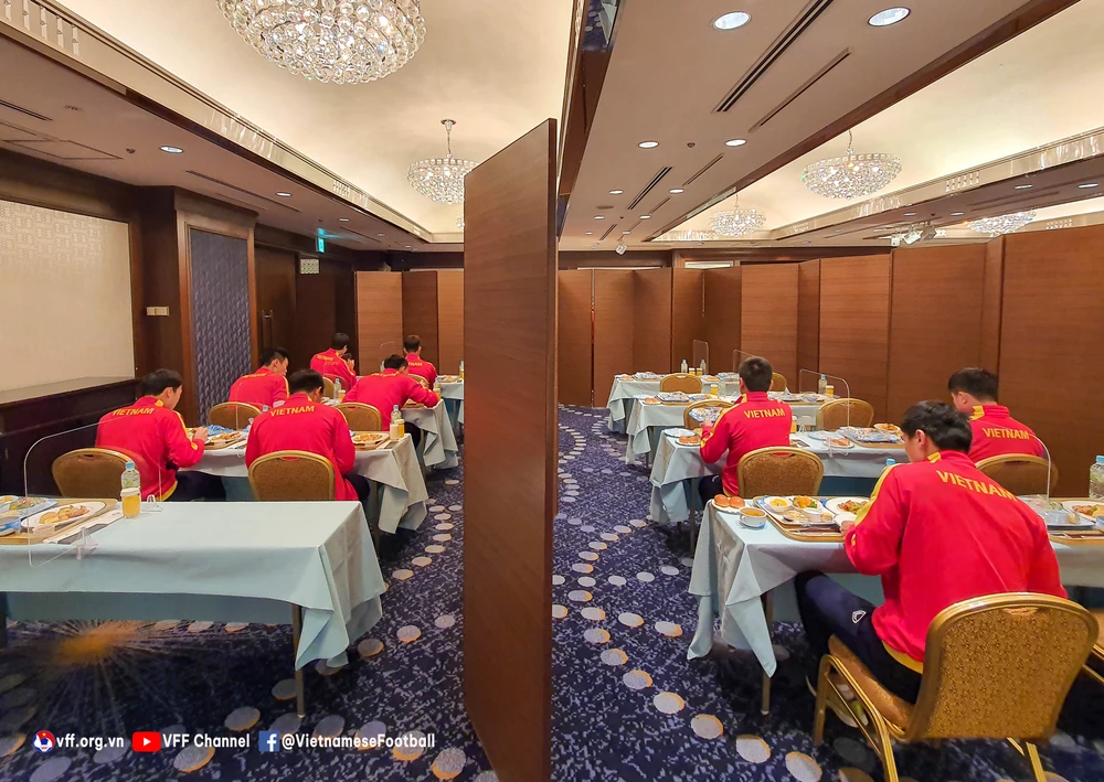 Việc ăn uống của cầu thủ Việt Nam cũng phải tuân thủ nguyên tắc phòng dịch COVID-19. ẢNH: VFF