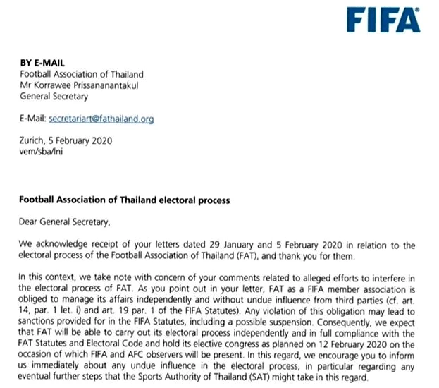 Ngay lập tức, Giám đốc điều hành hiệp hội thành viên FIFA - ông Veron Mosengo-Omba gửi cảnh báo: “… Về vấn đề này, chúng tôi khuyến khích các bạn thông báo cho chúng tôi ngay lập tức về bất kỳ sự can thiệp nào trong quá trình bầu cử, đặc biệt là về bất kỳ động thái nào mà Cục Thể thao Thái Lan (SAT) có thể thực hiện… Bất kỳ hành vi nào vi phạm quy định này có thể dẫn đến các biện pháp trừng phạt được quy định trong Điều lệ FIFA, bao gồm cả việc đình chỉ tư cách thành viên”.
