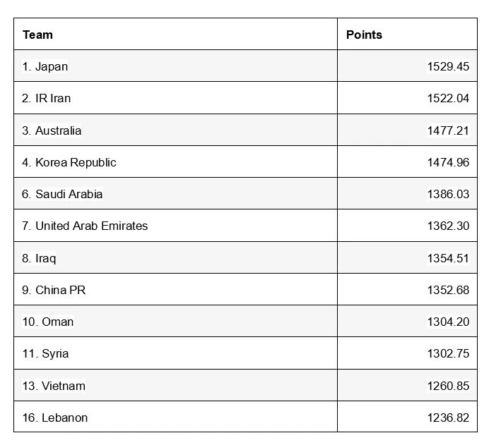 12 đội chia làm hai bảng nên có sáu nhóm hạt giống. Theo đó, Nhóm 1: Nhật, Iran; Nhóm 2: Úc, Hàn Quốc; Nhóm 3: Saudi Arabia, UAE; Nhóm 4: Iraq, Trung Quốc; Nhóm 5: Oman, Syria và nhóm 6: VN, Lebanon.