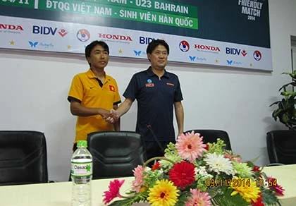 HLV Toshiya Miura (Tuyển VN, trái) bắt tay đồng nghiệp Moon Yoong Rae.