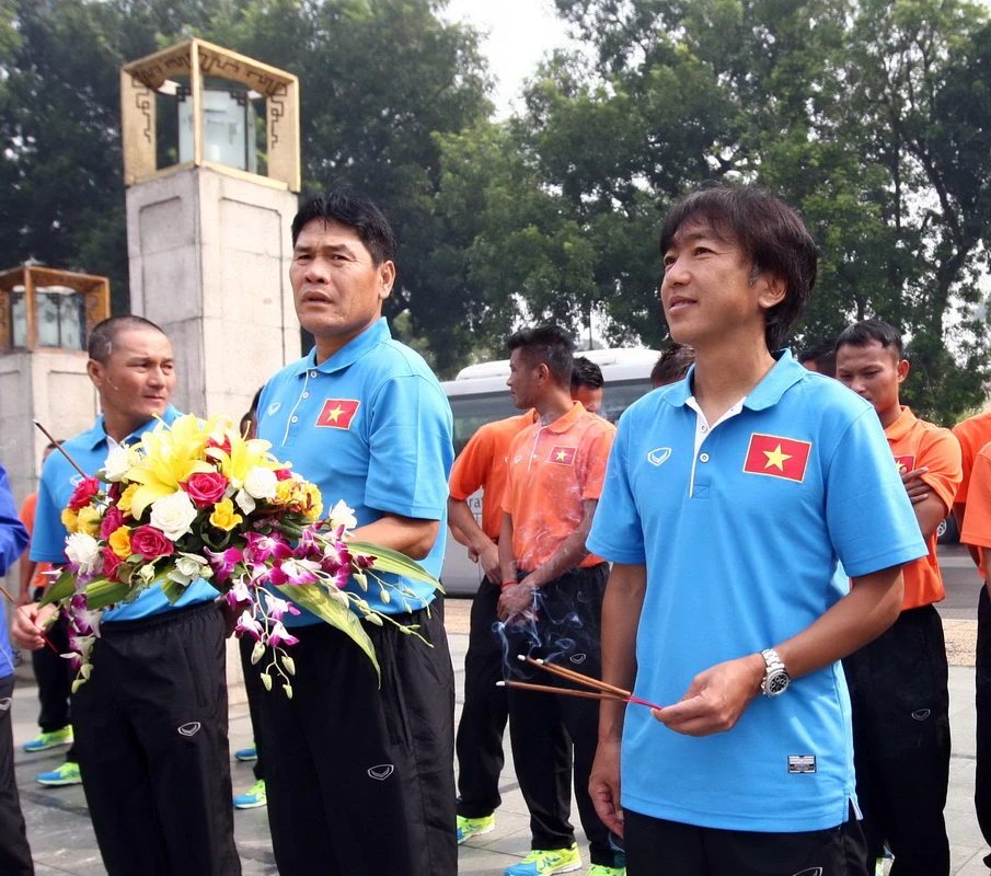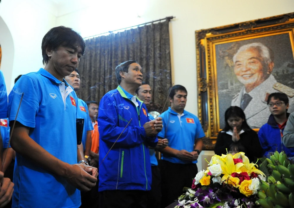 Trưởng đoàn TVN Mai Đức Chung và HLV Miura thắp hương trước bàn thờ Đại tướng. Thể hiện sự quyết tâm trên “chiến trường” Aff cúp.