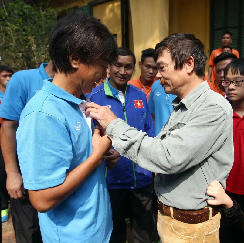 Con trai của Đại tướng - ông Võ Điện Biên đã thay mặt gia đình trao tặng HLV Miura Huy hiệu Đại tướng Võ Nguyên Giáp.