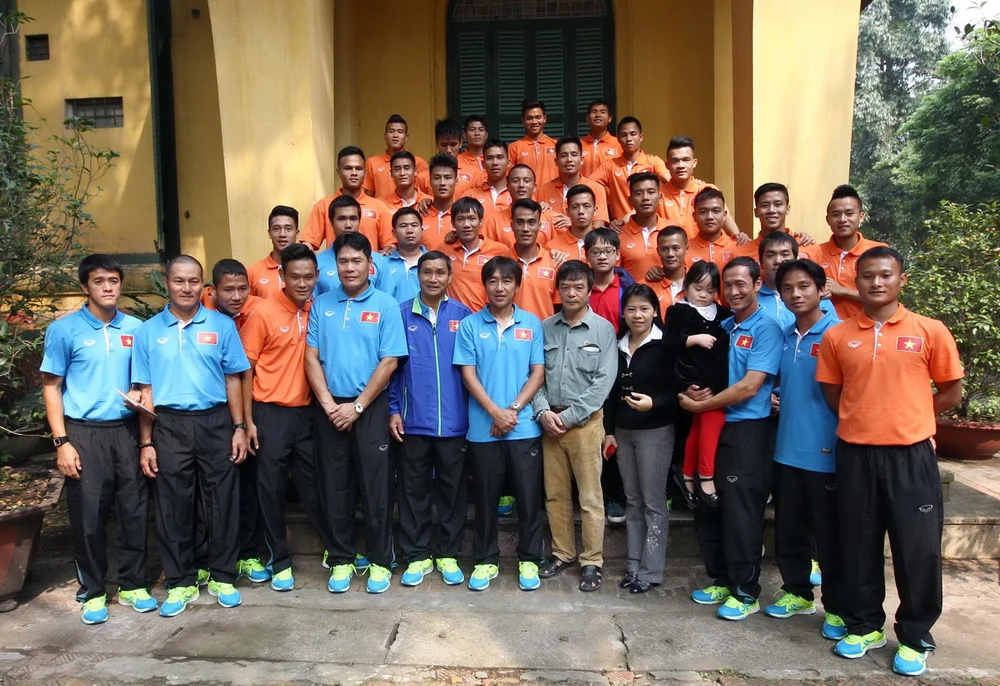 Toàn đội chụp hình lưu niệm với gia đình ông Võ Điện Biên - con trai của Đại tướng Võ Nguyên Giáp. Chiều nay, thầy trò HLV Miura sẽ có buổi tập lúc 18h trên SVĐ Mỹ Đình để chuẩn bị cho trận đấu khai mặc gặp ĐT Indonesia lúc 19h tối mai (22/11).